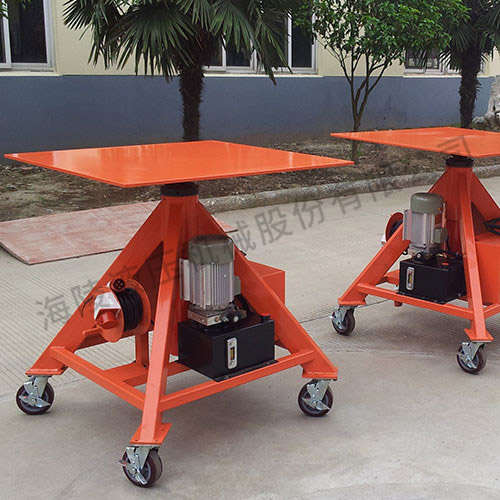 我公司生產的門機構安裝液壓升降平臺設備用于車輛客室側門承載驅動機構安裝作業。平臺設有過載保護裝置,具有一定的抗偏載能力;平臺工作面可旋轉360°,粘接10mm厚軟橡膠保護墊,工作臺面安裝有門機構支撐工裝,同時在平臺上下極限位置安裝限位裝置,在升降范圍內,能任意調節平臺的工作高度。